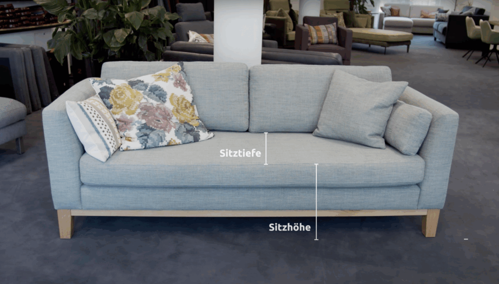 Die Sitztiefe entscheidet über das Sitzgefühl Ihres Sofas. Eine geringere Sitztiefe unterstützt eine aufrechte Sitzhaltung und erleichtert das Aufstehen, während eine größere Sitztiefe mehr Platz zum Relaxen oder Liegen bietet.